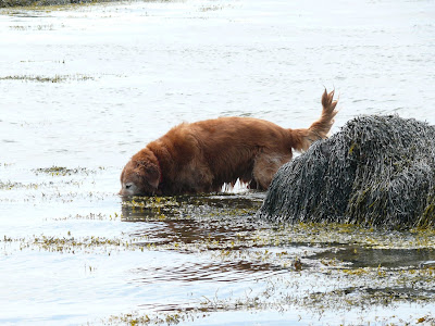 This is why we come here. The breeze off Penobscot Bay is downright COOL. Of course, if you walk a hundred yards up the hill to the office, it becomes just another warm summer day. The tide was out, so Durelle suggested a walk to the beach. Baxter hasn't had a chance to really get off the leash in quite a while, so down we went. Sand beaches this far north are few and far between. Rocks, we got. Gravel, we got; and everywhere, seaweed we got. It is under the rockweed that I find my trove of mussels. Baxter enjoyed the beach.